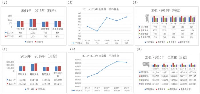 2014年から2015年の全業種時給(グラフ1)の比較からみると平均賃金・最高賃金・最低賃金・最多賃金の4項目とも上がった。